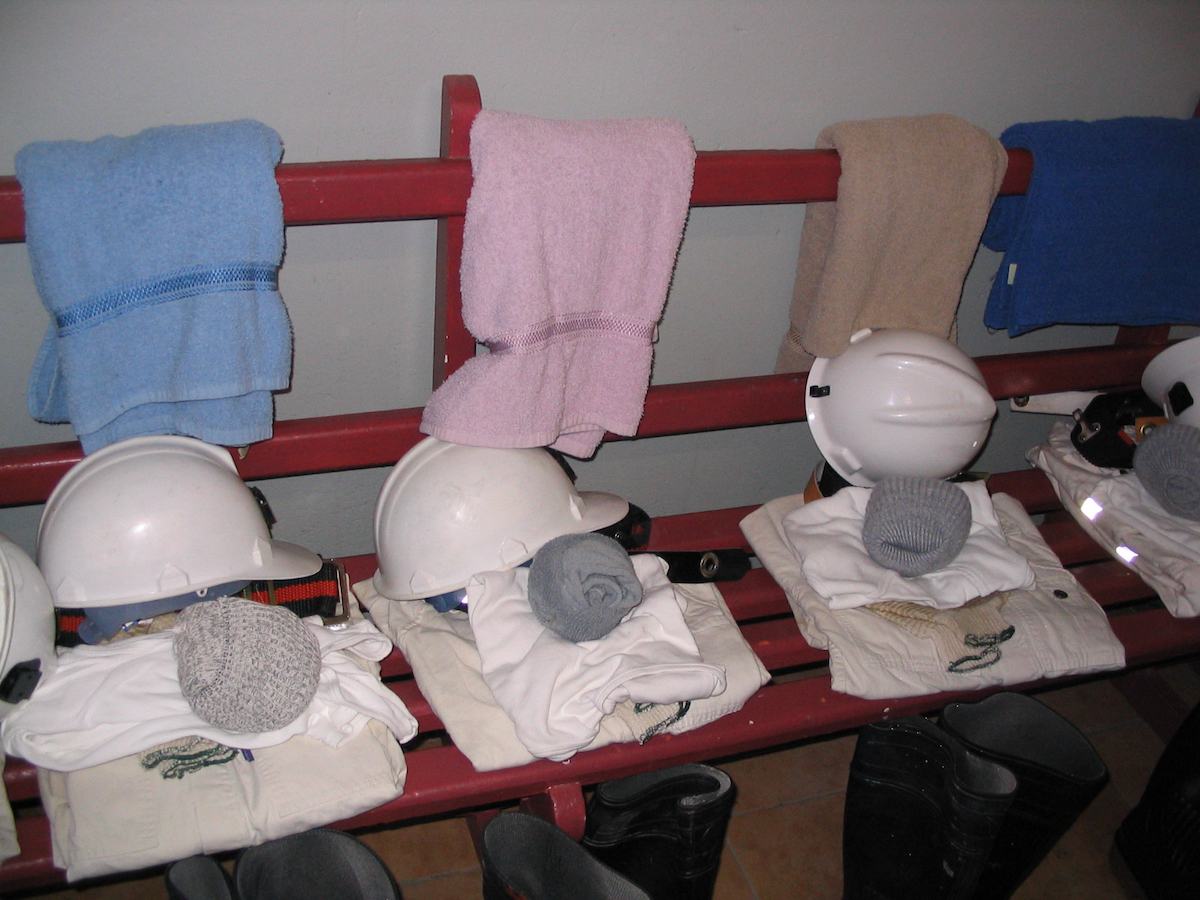 Upon arrival to the Townlands shaft, we were showed to the changing rooms. Our mining gear was waiting for us in neat little piles labeled with each of our names. We donned our knee high socks, coveralls, hard hats, rubber boots, belts and ear plugs and were extatic to see that we looked like real miners. We made our way over to the shaft where our outfits were completed with a head lamp attached to a good sized battery pack. We were ready to go.