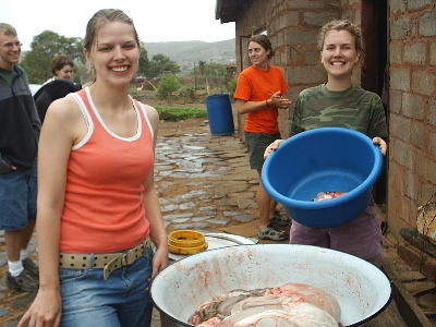 It is finally my chance to write the blog! Well we woke up morning at a bright 6am. We had gone to sleep the night before to the sound of a goat and woke up to many roosters, but the goat was silently hanging from a tree. The news was brought to us that tonight we would have a feast and goat was on the menu! A few were lucky enough to see the slaughtering, and a few more saw some of the preparation. They even had the liver and soul cooked up in time for breakfast.