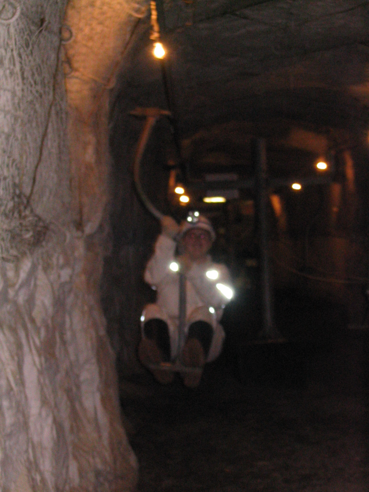 Following the tram ride, we discovered that although there's no skiing in South Africa, they still have chair lifts. To reach the working level of the mine we hopped on the miner's version of the chair lift. It looked a bit like a tricycle with no wheels attached to a cable. We zipped off down the inclined shaft (about a 17%) grade.