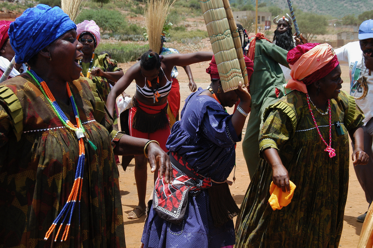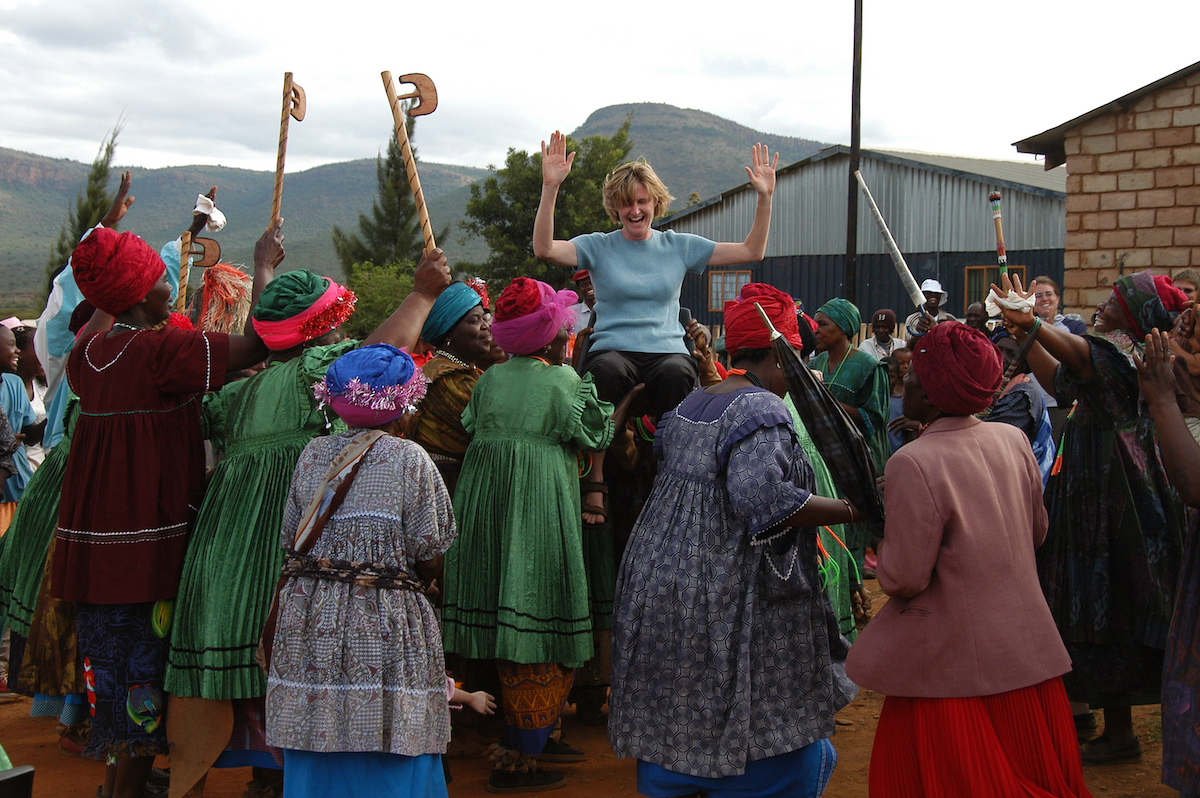 When we pulled up to the Community Center there were women dressed in bright colorful dresses doing a traditional tribal dance in our honor. After a couple of dances the women plunked Tracy in a chair and hoisted her up in the air and danced around her. As part of the culture we sang two songs back to them.