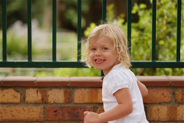 Catherine likes to "go to the merry-go-round," a spinning table in one corner of our yard. From a bench, she looks to the neighbor's yard at the "Bitzer Maloney dogs." The neighbor's two Dobermans look like the dog Bitzer Maloney from Lynley Dodd's Hairy Maclary books.