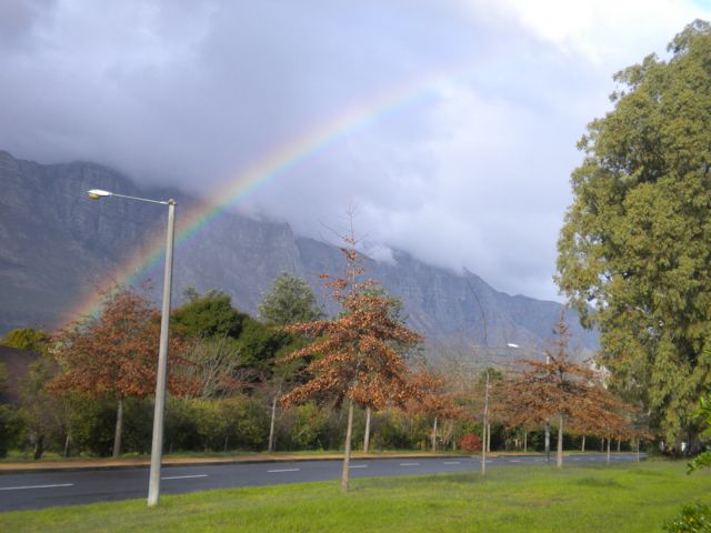 It was on and off again showers today. Several times, there would be bright sunshine after a shower. This is the second rainbow we saw in three days! It's almost a full one!