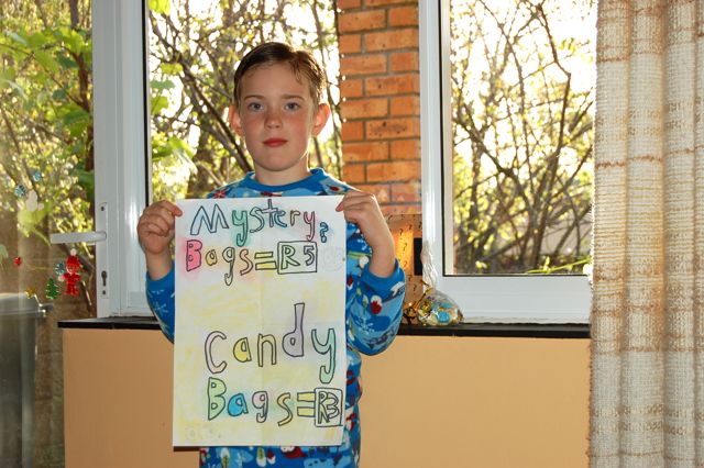 Here's Mark's advertising sign for the Mystery Bags and Candy Bags. Example bags are on the sill behind him.