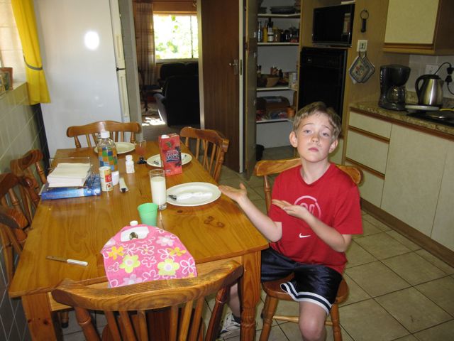 After our walk, I made spaghetti for dinner. Mark helped set the table, and he wrapped the silverware in napkins, just like a restaurant. He drew a curly mustache to assist his French waiter act. Then, Catherine had to copy. So, we had two lips to scrub clean tonight.