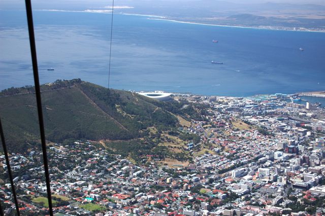 The cable car provides a very fast descent from the mountain. It also minimizes the pain and suffering in the knees. The cables, Signal Hill, and the newly-completed Cape Town world cup stadium are visible in the left side of the frame.