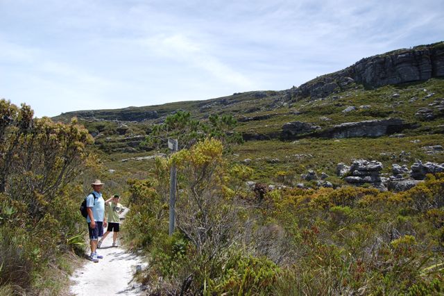 Ed and Mark are looking at the signpost that marks the midpoint between Skeleton Gorge and Maclear's Beacon.