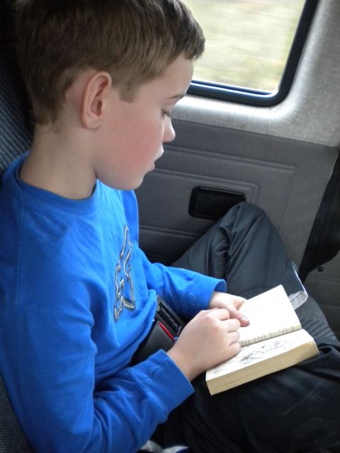 Done with Harry Potter #$, Mark read a new book, entitled "Kidnapped". He was kidnapped reading it; we didn't hear from him for the couple hours he was reading through it.