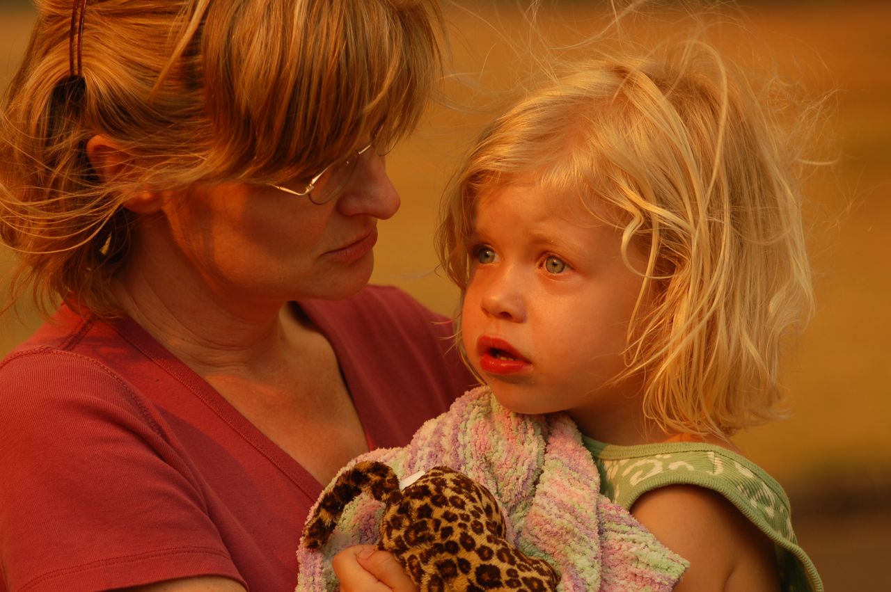 * Concern and comfort: Catherine is clearly concerned about the fires, being too young to understand and too small to do anything about it. But, she is comforted by her mother's arms, her blanket, and her mis-named "cheetah" (it's really a leopard).