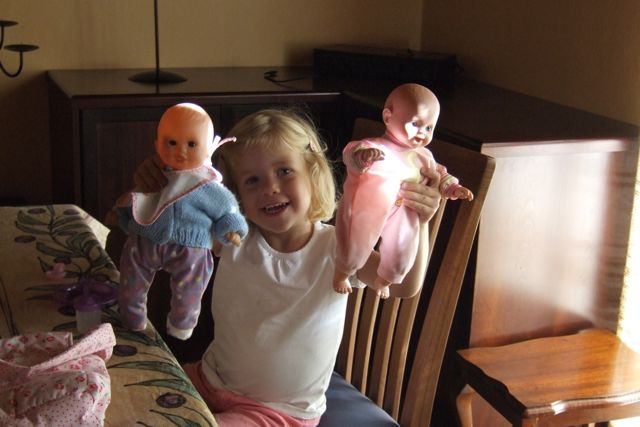 Catherine and Grandma played with babies in the afternoon. Catherine "fed" them porridge, pizza, and macaroni and cheese. One baby on each leg.
