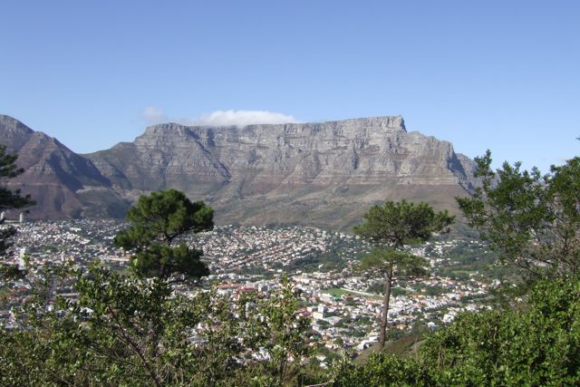 This is the view of Table Mountain from Signal Hill. The small tablecloth cloud on top was the only evidence of gale-force winds up there.