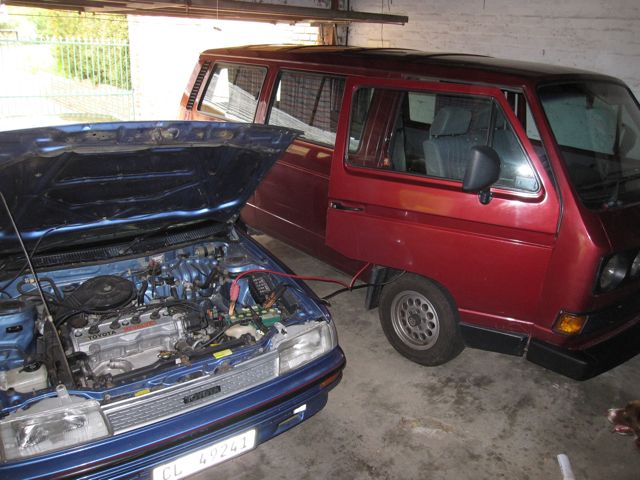 Luckily, the Kombi's battery is beneath the driver's seat, and the Corolla's battery is on the left side of the engine compartment. That made it easy to stretch the cables between the vehicles.