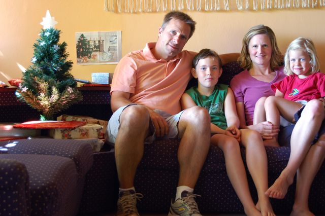 We took this family photo before opening gifts. Our Christmas tree is a small fibre-optic unit that alternates red, blue, green, and white.