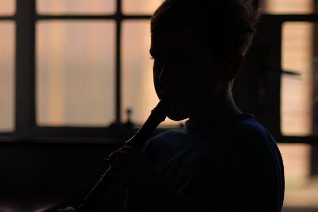 I usually help Mark with his recorder practicing. After we were done today, he practiced a bit on his own, and I snapped this photo. I like the near-silhouette effect.