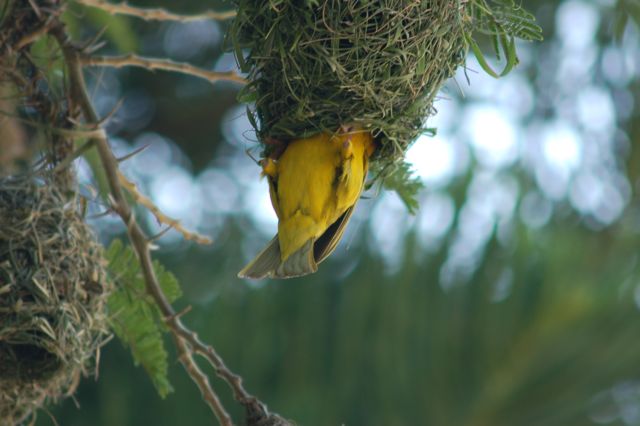 The birds were hanging on the undersides of the nests to inspect and add.