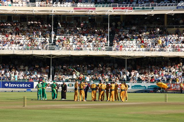 After a wicket is taken, there is quite a bit of commotion on the field. The fielding team makes a celebratory huddle. The umpires have a confab, and the batting team gathers to lick wounds and make a plan. In this picture the Australians have taken a wicket and are doing the celebrating.