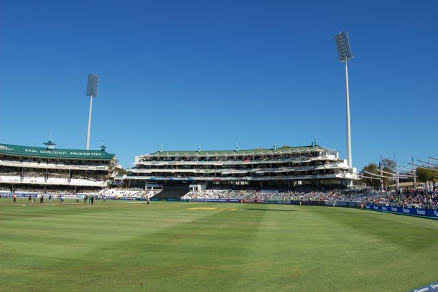 The Newlands cricket ground is known as one of the most beautiful in the world. In this photo, the pitch is being prepared for the game.