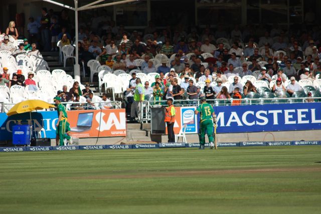 When you're out, you take a looooong walk from the center of the ground to the dressing room. Here Graeme Smith (the South African captain) departs the field after his wicket was taken rather early in the match.