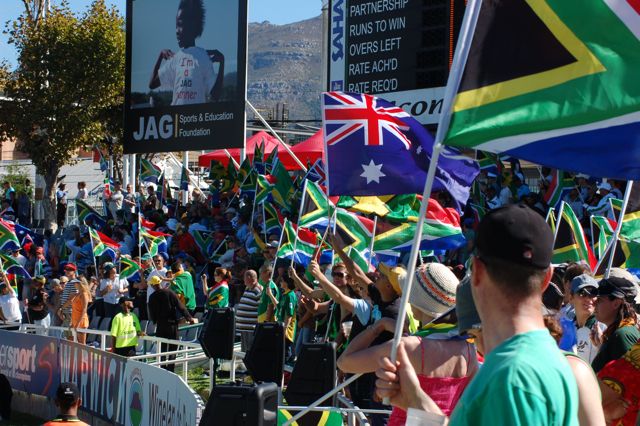 There were very few Australian fans in the ground. It must have been a mistake to let this guy in. When we arrived at the stadium, we were given a South African flag. After every exciting play, the fans unfurled their free flags.