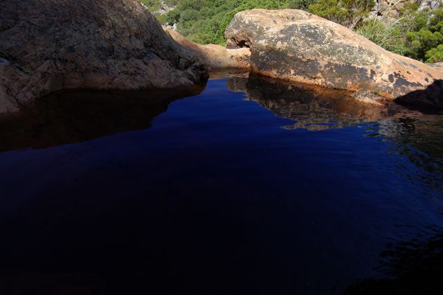 The light was awesome in the river valley this morning. I took this photo looking downstream from the rock bridge the separates the second and third pools. I love the way that my angle, the polarizing filter, and the morning sky made the water look purple.
