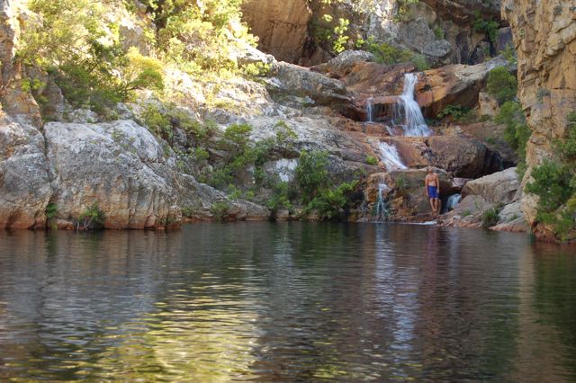 This waterfall (background) feeds the third pool (foreground). James is assessing the climb to a jump point. Both he and Mark eventually did the jump, which is about 12 meters. I declined. (For the record, neither of them have children.) I later jumped from a point to James' right in this photo (about 2.5 m).