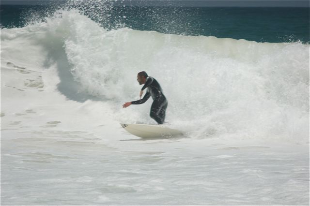 These are really tough conditions for making photos: extremely bright, white surf; black wetsuit; hazy noontime skies. In a word, awful.