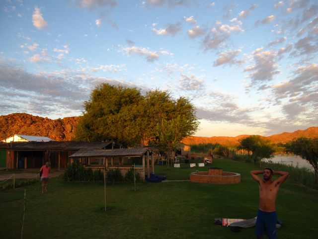 This is the view of base camp with the morning orange sun and bright clouds.