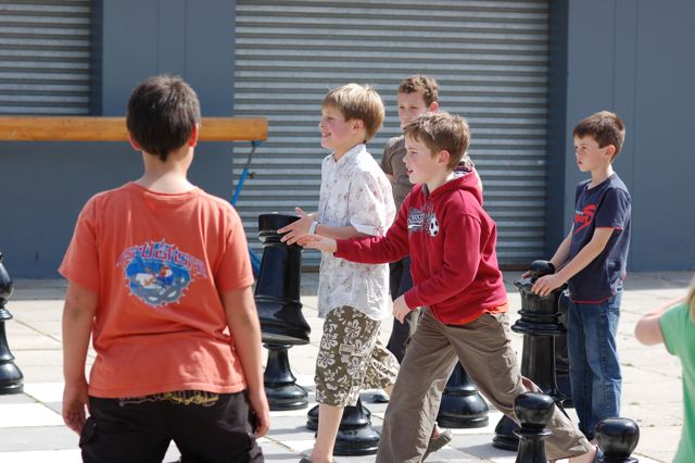 Between matches, the players were free to roam around the grounds. Laerskool Stellenbosch has a gigantic outdoor chessboard which received heavy use. Mark and his friends (Julian is in the white shirt) played against some other kids. They developed a strategy based on division of labor. One teammate was the "brain" and the other was the "mover." At other times, different teammates were responsible for moving different pieces.
