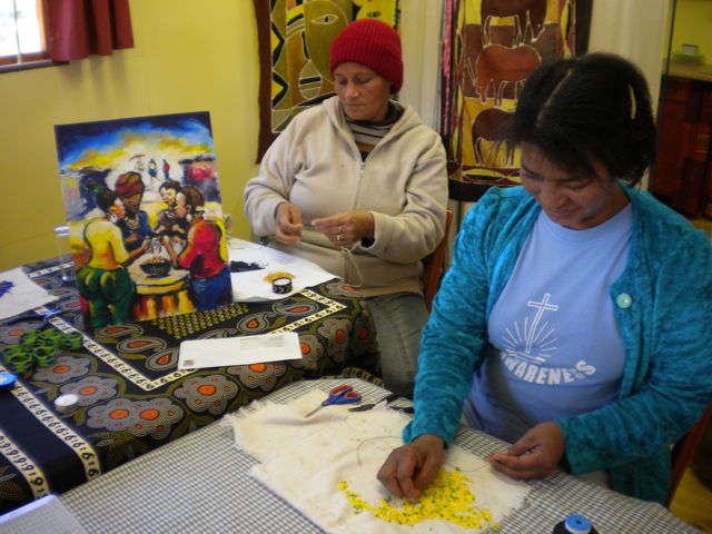 Here are two of the beaders in the shop. They're next to a painting by BlessinG that he gave to the women. Cindy found a BlessinG painting today.