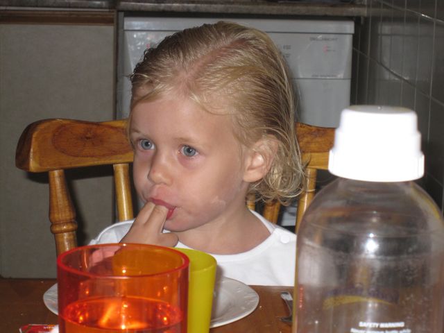 This was Catherine's response to being honored with "Happy Birthday." She was rather mystified by the entire day. She denied that it was her birthday and claimed that everyone else (Mom, Dad, Mark) was having a birthday today.