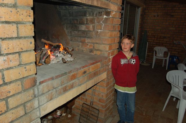 Mark helped with the fire in the braai at our house. You can see Tosca huddled below the fire. She was really agitated by noise and tried to jump up to see it.