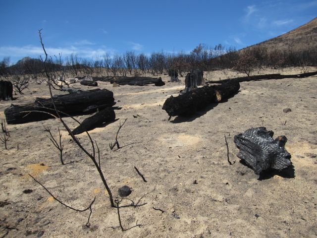 The devastation is nearly complete in the burned areas of the mountain. It doesn't look like anything could ever come back from this. There seems to be a real danger of widespread erosion, too. We'll see what happens when the rains begin in a few weeks.