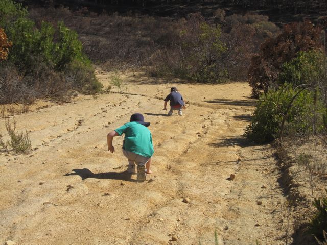 On the way down the mountain, the boys tried their best to slide without injury. It wasn't too steep, so they were successful in avoiding any scrapes or bruises.