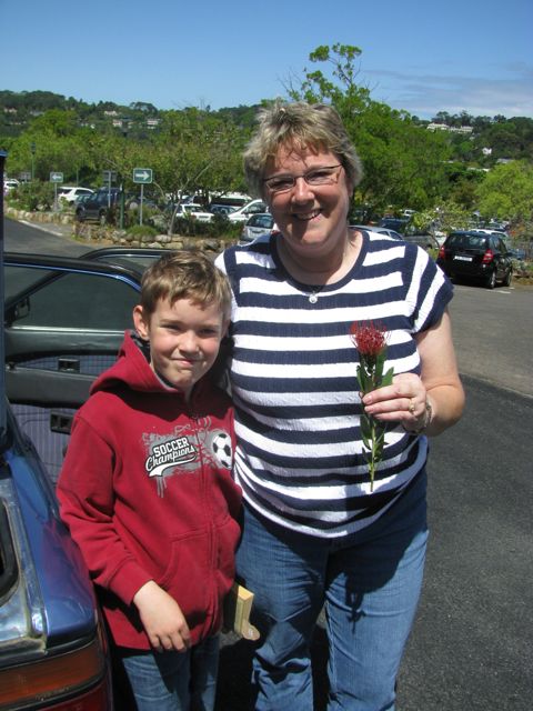 The gardeners at Kirstenbosch were trimming the pincushion plants. Mark picked up a trimmed flower and gave it to Henriet.