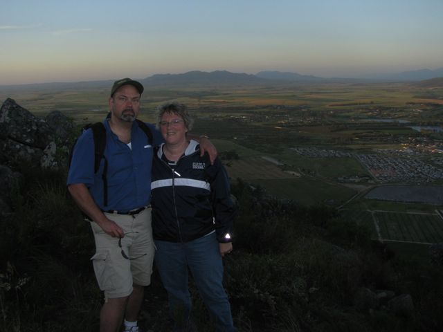 We took a different path down the koppie. On the descent, we walked on the Paarl side. I took this photo of Jim and Henriet using a flash.
