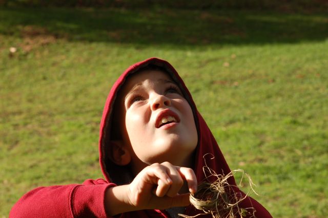 Mark found the beginnings of a small bird's nest on the ground. He's looking for its source.