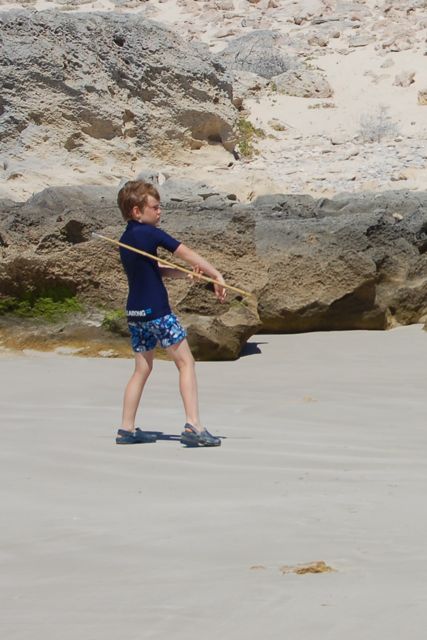 Mark played with the handle of a butterfly net, pretending to be a ninja.