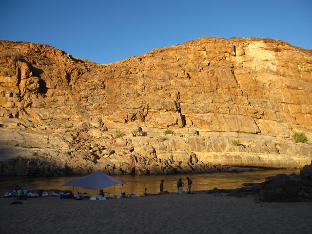 The sunrise at Beach campsite is beautiful, because it lights up the rock face on the Namibian side of the river.