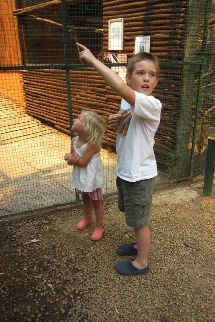 A white parrot startled us by saying "Hello!" as we approached this gate. Mark is pointing it out to Tracy in this photo. After we went past it, the little guy said "Goodbye!"
