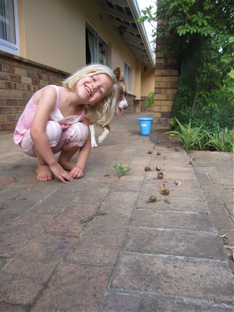 The first thing Catherine noticed today were the large number of snails on the front porch. So, after breakfast she went out there and collected LOTS of them in her blue bucket. Then, she put one snail on each brick ...