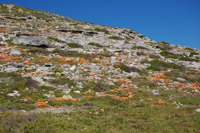 I took a short hike up an oceanside hill and snapped this picture of orange daisies growing amongst the rocks.