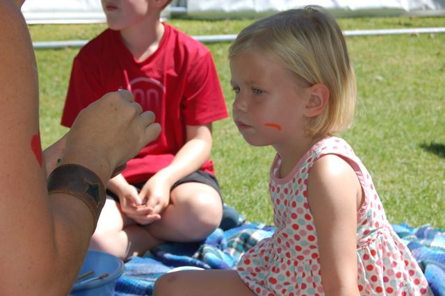 One of the activities for kids was face painting. Catherine waited patiently while her cheek was painted with a rainbow (her request).
