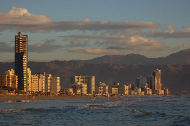 The Strand beachfront buildings shone brightly against the dark mountains as the sun sank behind Muizenberg on the other side of False Bay.