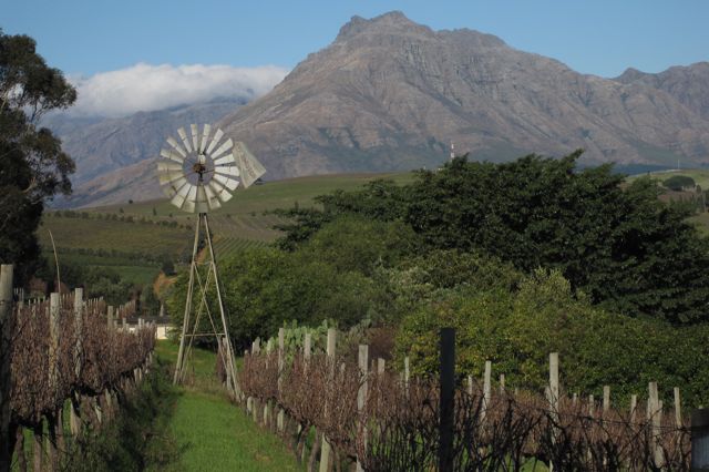 This old, dilapidated wind turbine remains in the vineyard.