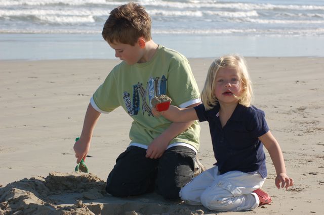 Mark and Catherine enjoyed playing in the sand. Mark dug a large hole, surrounded it by a dike, and put a moat in front. He desperately wanted the tide to rise, so he could see how it performed. We had to leave before it did.