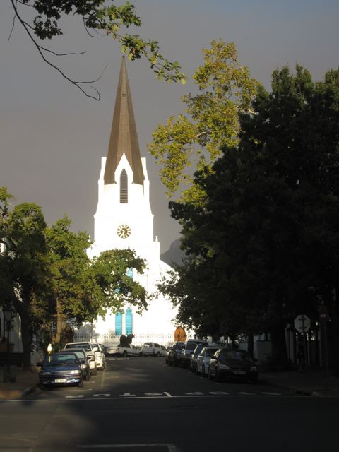The NGK church in Stellenbosch. The dark clouds in the background are caused by smoke from the recent fires.