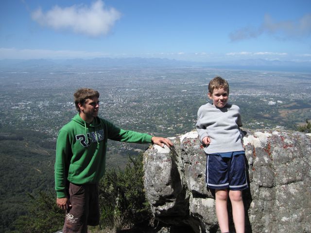 ... an amazing vista. The cave is on the point between Skeleton Gorge and Nursery Ravine. So, it affords a 270° view eastward across the Cape Flats. If you know what to look for, you can see Simonsberg in Stellenbosch over Pieka's right shoulder. False Bay is to the right.