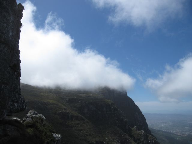 But, when we looked north from the cave, we could see clouds gathering over Table Mountain and Maclear's Beacon. At this point, we were VERY happy that we chose not to walk to the cableway.