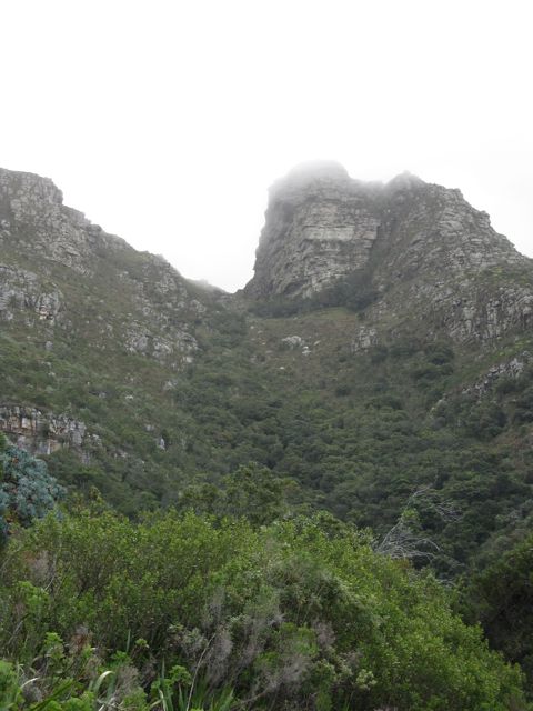 This photo looks back up Nursery Ravine from the bottom. Castle Rock, the location of the third cave, is in the upper right of this image. During our descent, clouds continued to thicken over the mountain, almost completely shrouding it.