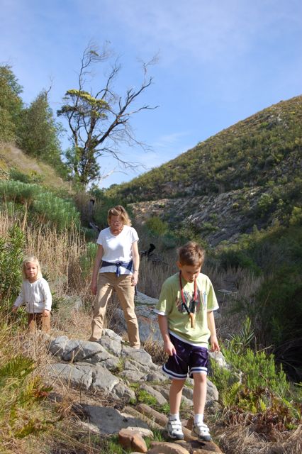 The valley trail winds along the rocky banks of the Onrus river. Mark is wearing his slingshot, because we were concerned about baboons. He had a pocket full of marbles (not mumbles) for ammunition.