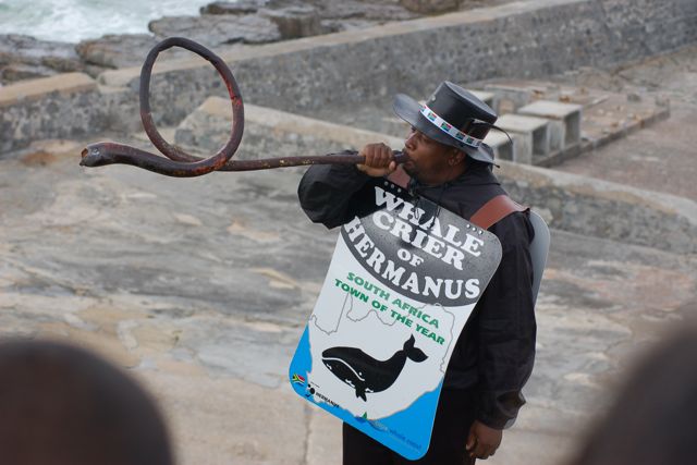 The Whale Crier blows a kelp horn to announce the location of the whales. The announcements are made using sequences of short and long sounds, loosely based on Morse code: